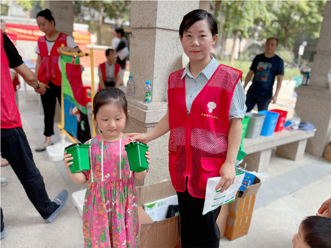 首先,黨員志愿者向社區的小朋友們介紹了垃圾四分類的標識及顏色,并通過生動直觀的講解讓大家認識到垃圾正確分類的重要性。志愿者們利用“分類垃圾桶”引導小朋友認識“可回收物”、“其他垃圾”、“有害垃圾”、“廚余垃圾”四種分類垃圾桶,志愿者還就日常家庭生活中產生的垃圾,細致地講解如何將其分類,倡導大家做好生活垃圾分類,實現資源再利用。